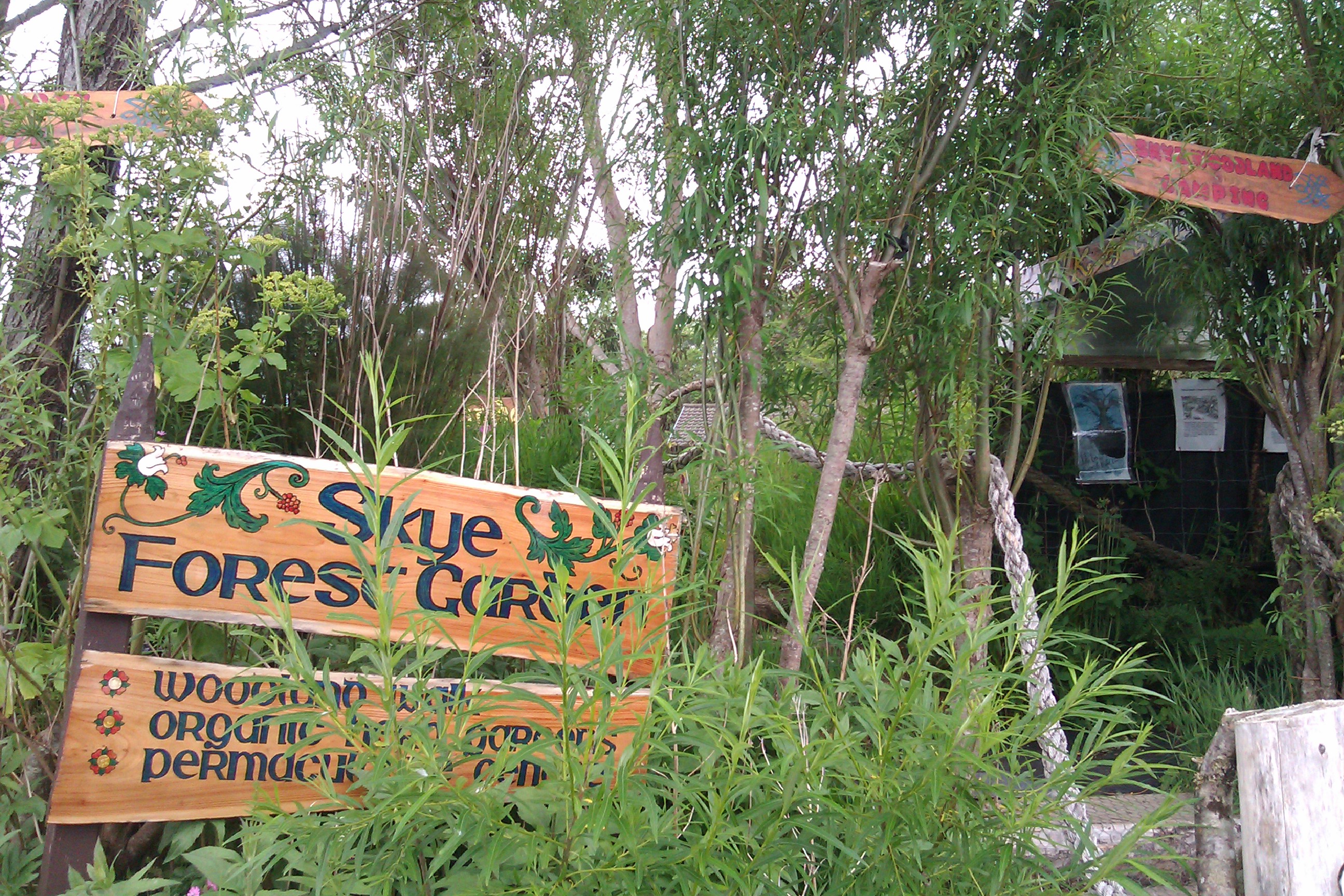 It would be hard to miss the colourful entrance to Rubha Phoil – Skye Permaculture when you step off the ferry from Mallaig at Armadale pier on the southern tip of Skye. The Sleat Peninsula, known as the garden of Skye and the 16 acre spit of lush verdant woodland at Rubha Phoil is just that in microcosm – a meandering magical woodland garden. Rubha Phoil is Gaelic for Paul’s Point, named after Paul Macdonald who landed there with his brothers in their flight from Glencoe following the massacre of 1692.